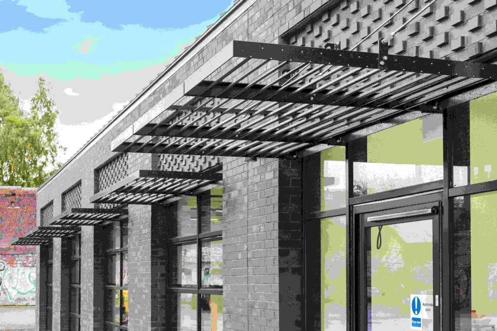 The scheme included ten brise soleils to regulate sunlight and reduce glare, and a cantilever canopy engineered to mirror their design. Together, these features provide effective solar control while complementing the industrial character of the Grade II listed warehouse.